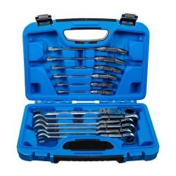 - Der Doppelgelenk-Ratschenring-Maulschlüssel-Satz eignet sich bestens für schwer zugängliche Arbeitsbereiche auf engstem Raum und tief liegende Schraubverbindungen.