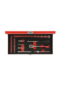 - Der Steckschlüssel-Satz wird in einem roten Stahlblechkoffer mit Schaumstoffeinlage verstaut und geliefert.