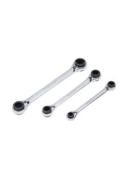 - Dieser Werkzeug-Satz beinhaltet drei Ratschen-Ringschlüssel, die in ihrer Schlüsselweite umschaltbar sind.