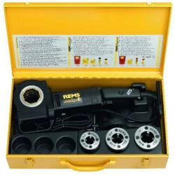 - Lieferumfang – Elektrische Gewindeschneidkluppe und REMS eva Schnellwechsel-Schneidköpfe im stabilen Stahlblechkasten