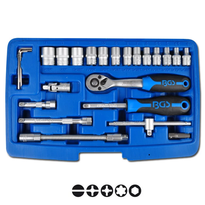 - Steckschlüsselsatz, DIN, 1/4″ – 46-teilig