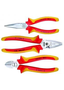 - der 3-teilige Zangen-Satz hat VDE isolierte Schenkel bis 1000 V und eine Hüllenisolierung