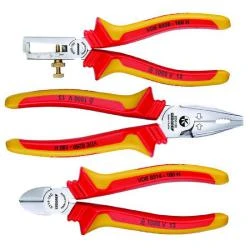 - der 3-teilige Zangen-Satz hat VDE isolierte Schenkel bis 1000 V und eine Hüllenisolierung